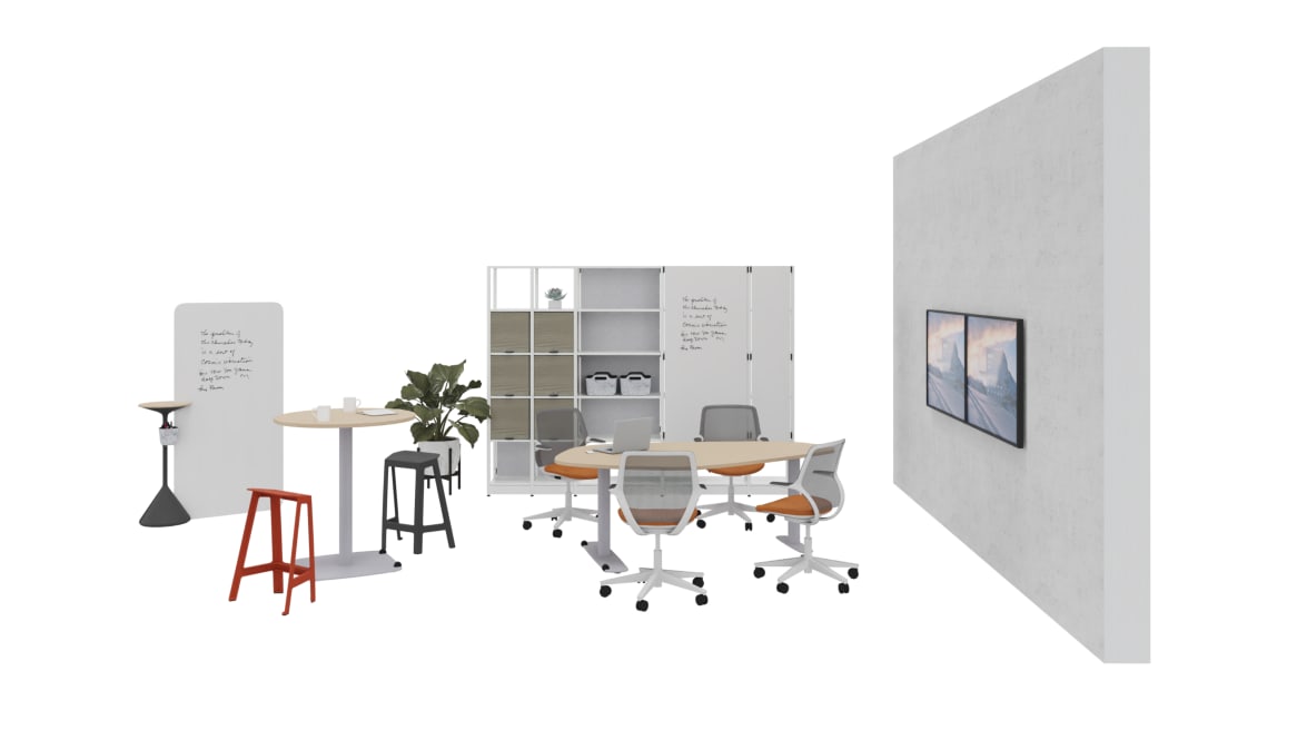 This open collaboration space can be used as an impromptu, shared space for team meetings or as an owned, ongoing project area. With task seating that supports longer-duration sessions, the space can flex to suit the needs of various group needs, with both flexible and fixed elements providing visual boundary from adjacent spaces.