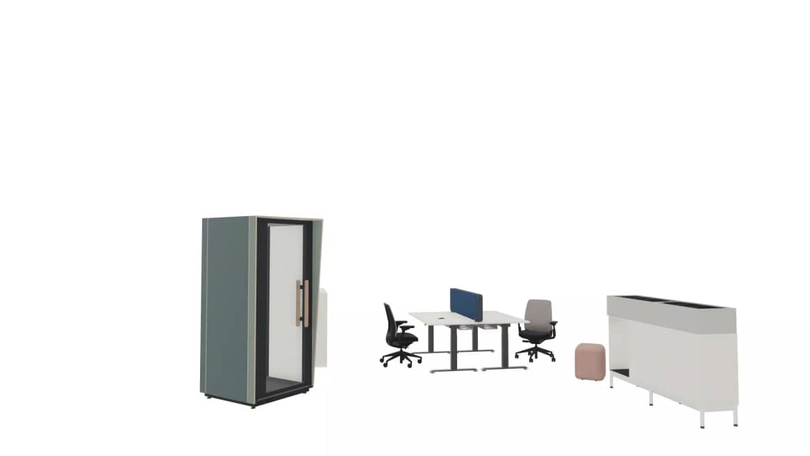 Dieser Arbeitsbereich vereint die Bedürfnisse von Einzelpersonen und Teams und unterstützt sowohl konzentriertes Arbeiten als auch dynamische Zusammenarbeit. Die ergonomischen Sitzmöbel, höhenverstellbaren Schreibtische und Sichtschutzwände fördern Komfort und Konzentration, während die Akustikkabine einen ruhigen, abgeschlossenen Raum für vertrauliche Gespräche oder stille Rückzugsorte bietet. Dieses flexible Layout ermöglicht einen nahtlosen Wechsel zwischen individuellen Aufgaben und Teamaktivitäten und befähigt die Menschen, den ganzen Tag über effizient zu arbeiten.