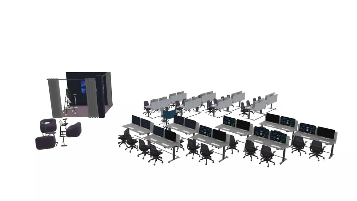Dieser Raum konzentriert sich auf leistungsstarke, spezialisierte Lernumgebungen, die es Studierenden ermöglichen, neue Technologien zu erkunden, zu testen und zu erproben. Durch die Aktivierung von Rand- und Eckbereichen wird die Fläche optimal genutzt und klar definierte Lernzonen werden erweitert. Einzelmonitore, großformatige Wanddisplays und ergonomische Arbeitsstühle steigern die Leistungsfähigkeit und unterstützen sowohl individuelles als auch gemeinschaftliches Arbeiten. Geschützte, sichere Bereiche bieten geeignete Umgebungen für Demonstrationen und Tests neuer Plattformen – ohne Störungen.