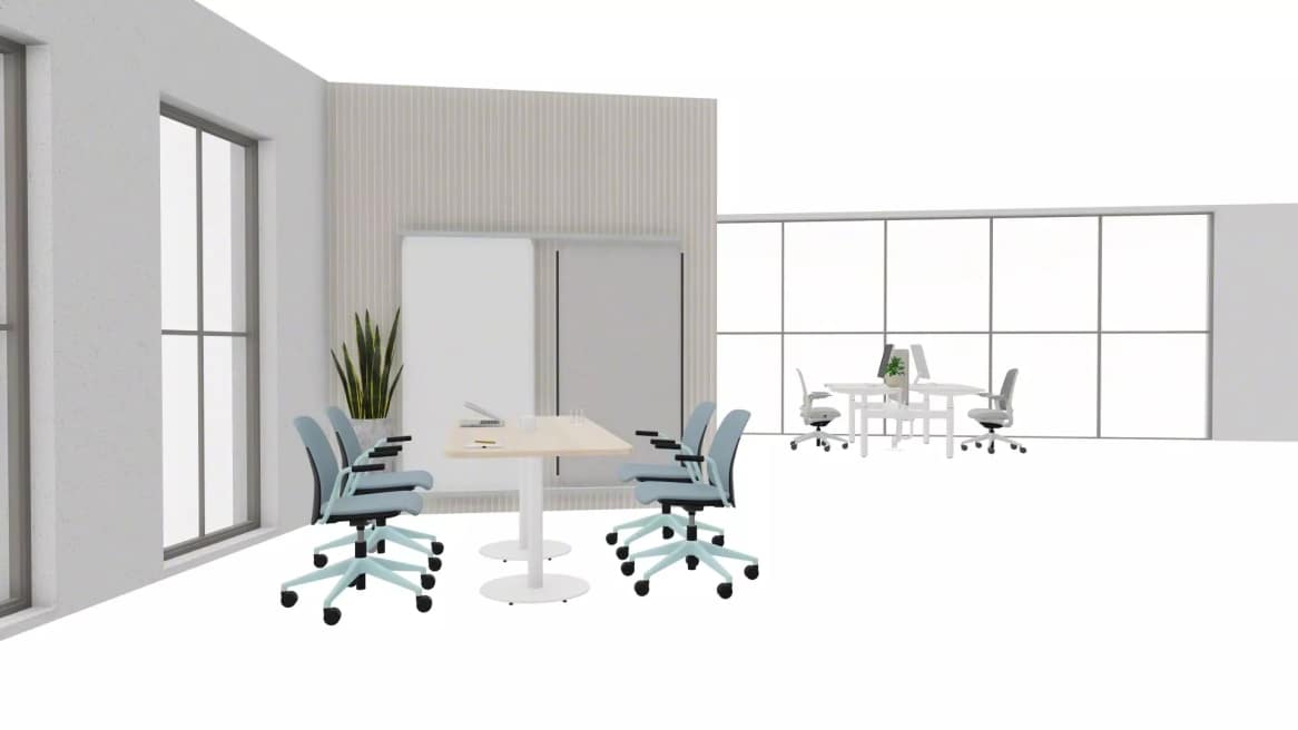 Diese offene Bürofläche bietet einen flexiblen Bereich für Gäste, externe Partner und alle, die eine Alternative zu ihrem festen Teamarbeitsplatz suchen. In Kombination mit dem Obelos-Tisch und den Steelcase Series M Stühlen ermöglicht dieser Arbeitsbereich einfache Wechsel zwischen konzentriertem Arbeiten und kurzem Austausch – ideal für die kurzfristige Nutzung.