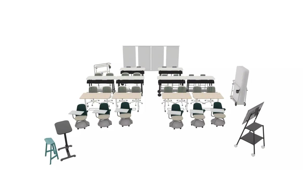 Eine gestufte Lernumgebung für Bildung mit Wirkung – ausgestattet mit mobilen Tablet-Stühlen, flexiblen Tischen und Stehtischen. Der Raum unterstützt Haltungsvielfalt, Präsentationsstil und Rückzugsmomente durch anpassbare Layouts und inklusives.
