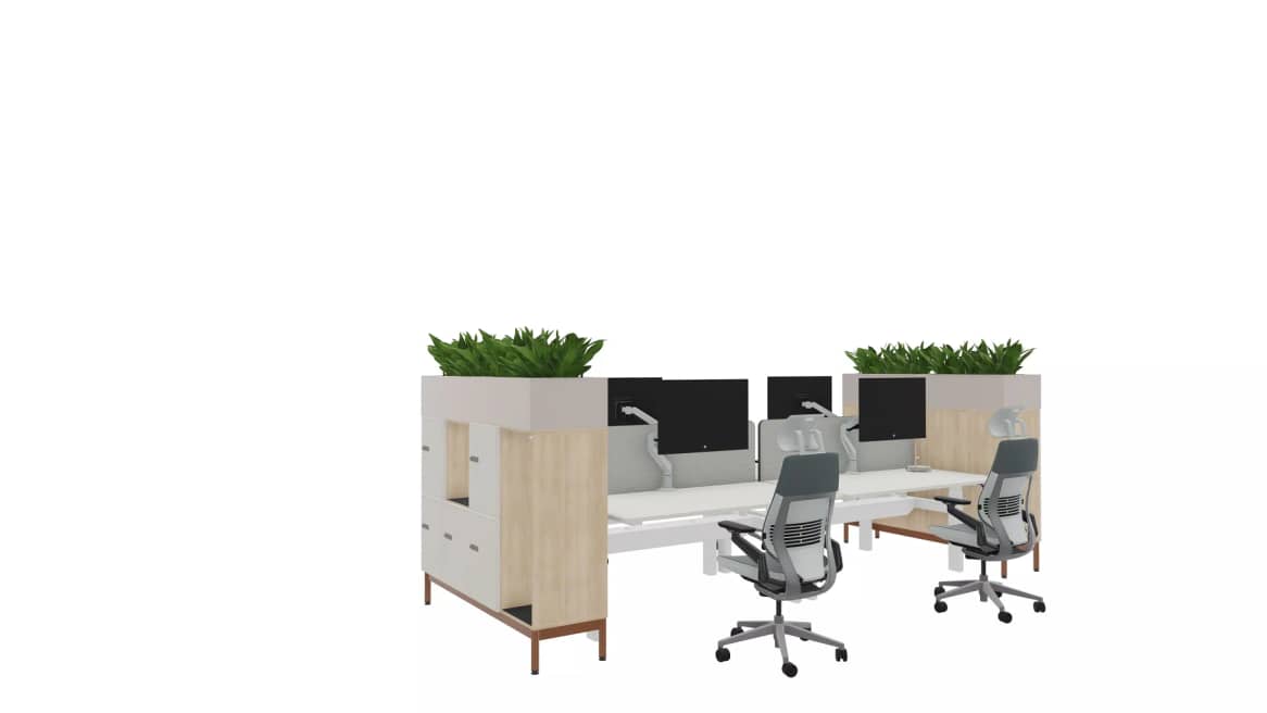 Höhenverstellbare Schreibtische in einem offenen Raum werden mit Pflanzgefäßen und Schließfächern kombiniert, die als Sichtschutz dienen. Diese halbprivate Umgebung unterstützt fokussiertes Arbeiten und balanciert Offenheit mit persönlichem Raum zur Steigerung von Produktivität und Wohlbefinden.
