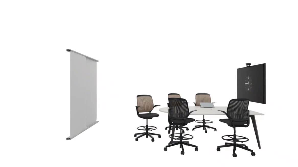 Diese Lösung ermöglicht hybride Zusammenarbeit, indem sie den richtigen Raum für persönliche und virtuelle Meetings schafft. Die integrierte Technologie unterstützt offene Kommunikation und erleichtert die Verbindung zwischen Menschen, unabhängig davon, ob sie im Büro oder remote arbeiten. Der zentrale Tisch, ergonomische Sitzmöbel, Whiteboards und Bildschirm schaffen eine engagierte Atmosphäre für strategische Diskussionen, Abstimmungen und Teammeetings.