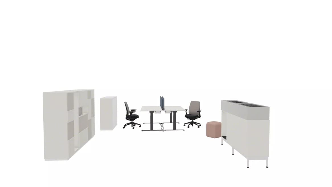 Dieser Arbeitsbereich vereint die Bedürfnisse von Einzelpersonen und Teams und unterstützt sowohl konzentriertes Arbeiten als auch dynamische Zusammenarbeit. Die ergonomischen Sitzmöbel, höhenverstellbaren Schreibtische und Sichtschutzwände fördern Komfort und Konzentration, während die Akustikkabine einen ruhigen, abgeschlossenen Raum für vertrauliche Gespräche oder stille Rückzugsorte bietet. Dieses flexible Layout ermöglicht einen nahtlosen Wechsel zwischen individuellen Aufgaben und Teamaktivitäten und befähigt die Menschen, den ganzen Tag über effizient zu arbeiten.