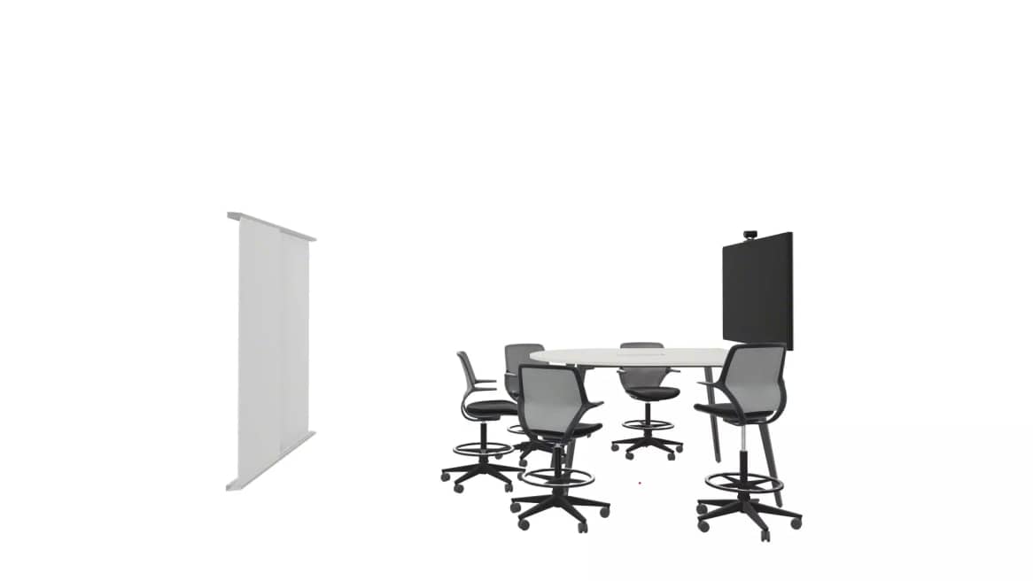 Diese Lösung ermöglicht hybride Zusammenarbeit, indem sie den richtigen Raum für persönliche und virtuelle Meetings schafft. Die integrierte Technologie unterstützt offene Kommunikation und erleichtert die Verbindung zwischen Menschen, unabhängig davon, ob sie im Büro oder remote arbeiten. Der zentrale Tisch, ergonomische Sitzmöbel, Whiteboards und Bildschirm schaffen eine engagierte Atmosphäre für strategische Diskussionen, Abstimmungen und Teammeetings.