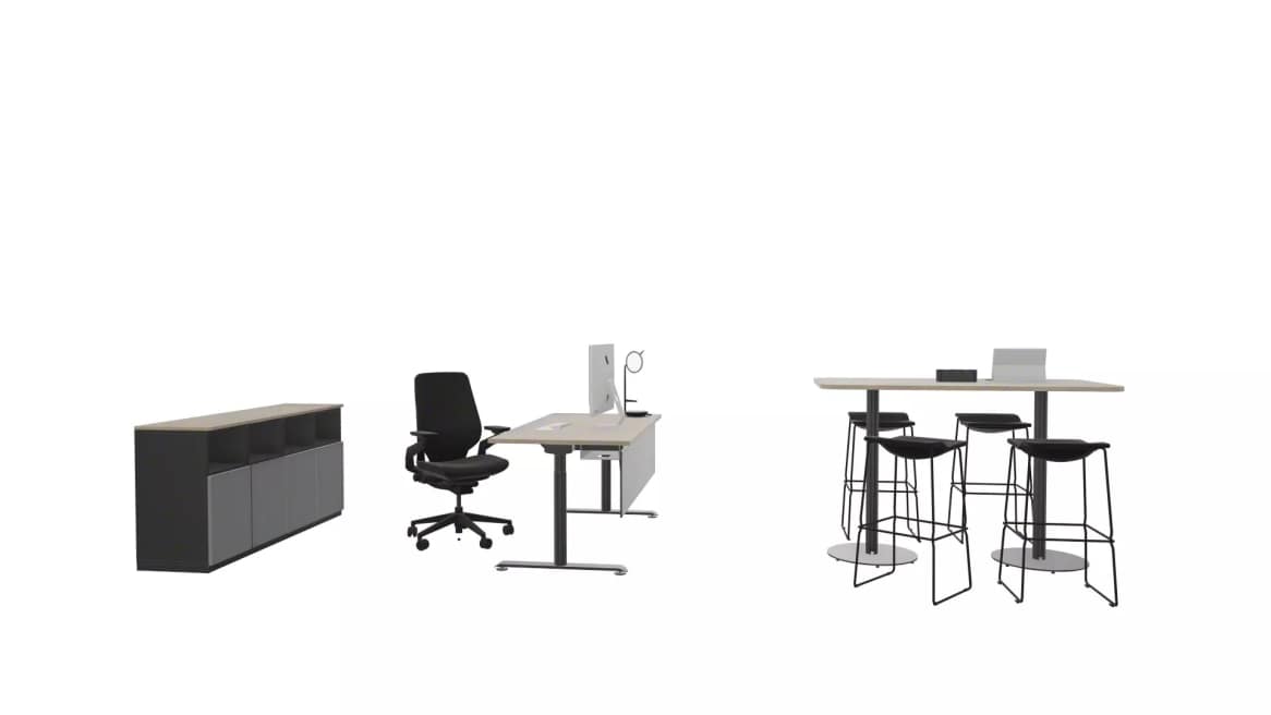 Diese vielseitige Lösung kombiniert einen individuellen Arbeitsplatz für fokussiertes Arbeiten mit einer kollaborativen Besprechungsecke. Der ergonomische Arbeitsstuhl und der Schreibtisch sind ideal für tiefgehende Konzentration und Privatsphäre bei vertraulichen Aufgaben, während der angrenzende Hochtisch schnelle Abstimmungen und strukturierte Zusammenarbeit unterstützt. Dieser Bereich bietet den Komfort und die Anpassungsfähigkeit, die Einzelpersonen benötigen, um ihre beste Arbeit zu leisten.