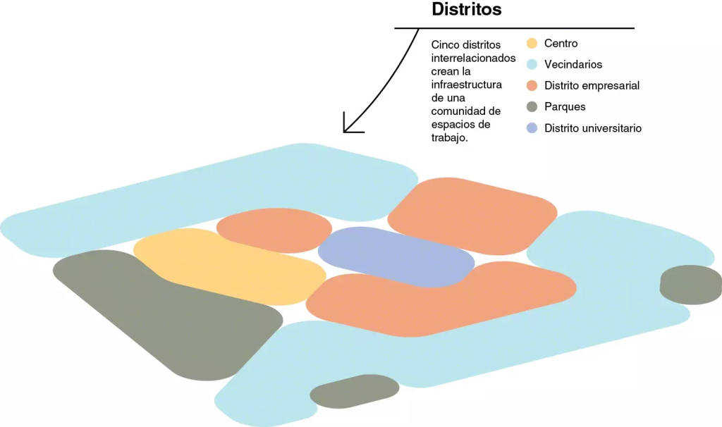 El Community-Based Design se basa en cinco “distritos” de uso mixto que crean la infraestructura física necesaria para distintos tipos de trabajo.