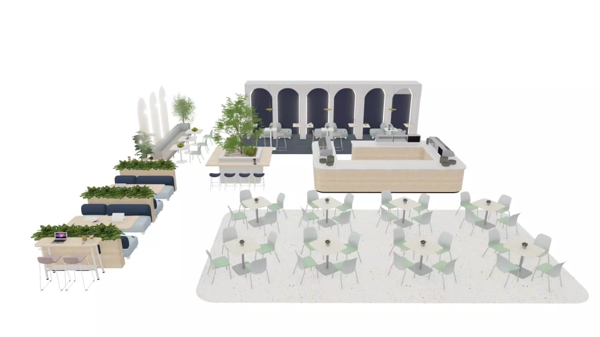 Este diseño representa un entorno de cafetería inclusivo y acogedor, donde la luz natural, una paleta de colores suaves y elementos biofílicos acogen a los estudiantes a un espacio cálido y abierto. La proximidad a los servicios de comida y bebida, junto con amplias superficies para materiales de estudio, fomenta su uso durante todo el día y la noche. Una combinación funcional de configuraciones —desde sociales hasta más privadas, con opciones de mesas sentadas y en altura— admite una amplia variedad de actividades. Mesas y sillas flexibles pueden reorganizarse fácilmente para adaptarse a necesidades cambiantes, desde el estudio individual hasta eventos comunitarios y sociales.