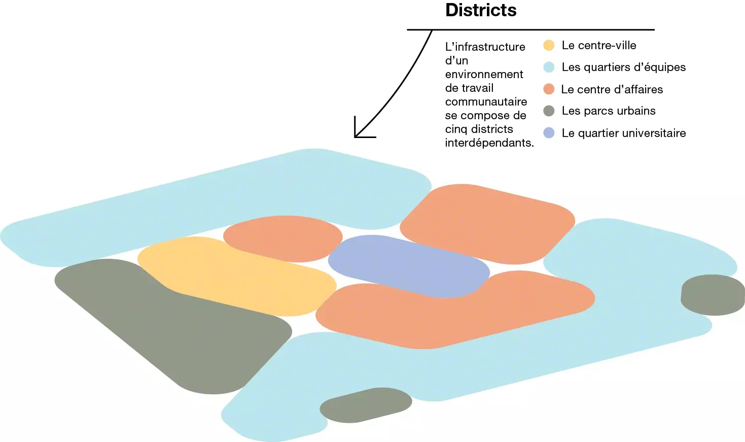 Cette recherche a conduit au développement du Design communautaire, l’approche de Steelcase pour créer des espaces de travail qui soutiennent activement le bien-être, aidant les gens à penser plus clairement, à se sentir plus connectés et à donner le meilleur d’eux-mêmes. Cette approche stratégique du design s’inspire des principes de l’urbanisme pour créer des environnements dynamiques et adaptables où chacun peut s’épanouir – des espaces qui soutiennent différents modes de travail, favorisent la connexion humaine et s’adaptent au changement. Tout comme les grandes villes offrent un mélange de bibliothèques publiques, de parcs, de maisons, de cafés animés et de pôles collaboratifs, le bureau peut proposer différents « quartiers » : centres-villes, quartiers d’équipe, quartiers d’affaires, parcs urbains et quartiers universitaires. Chaque quartier est conçu pour soutenir un mode cognitif spécifique – concentration, collaboration, socialisation, apprentissage et régénération –, permettant à chacun de passer facilement d’un type de travail ou d’état mental à un autre au fil de la journée.