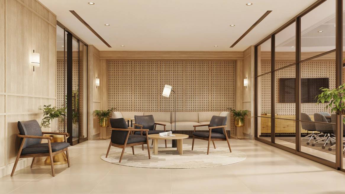 Benches round out the collection, sharing fabric and wood details with the guest chairs and lounges.