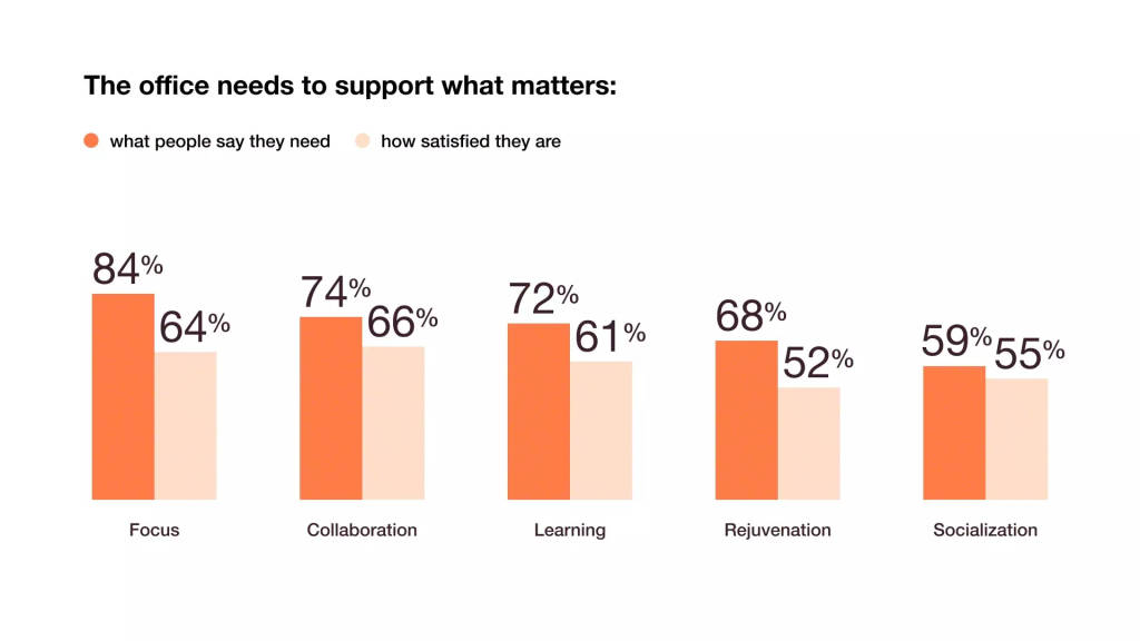 One likely reason why: across the board, people are not happy with how their spaces support what they think is most important. Gaps are sizable and have a real impact.