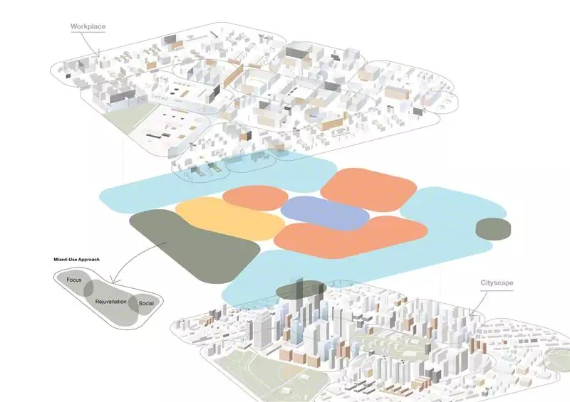This research led to Community-Based Design, the Steelcase approach for creating workplaces that actively supports wellbeing — helping people think more clearly, feel more connected and perform at their best. This strategic approach to workplace design draws from successful urban planning principles to create vibrant, adaptable environments where people can thrive—one that supports diverse work modes, fosters human connection, and adapts to change. Just as great cities offer a mix of public libraries, parks, quiet homes, bustling cafés and collaborative hubs, the office can provide people with different “districts” to choose from: city centers, team neighborhoods, business districts, urban parks and university districts. Each district is designed to support a specific cognitive mode—focus, collaboration, socialization, learning and rejuvenation—allowing individuals to move fluidly between different types of work and mental states throughout the day.