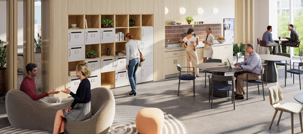 This vibrant hub blends the comfort and energy of a café with the functionality of a workplace. As more organizations move to shared workstations, this space supports people’s new routines. At the start of their day, it provides them with a place to store personal items, grab a coffee and socialize. It also draws people together throughout the day — for casual conversations, dining,
