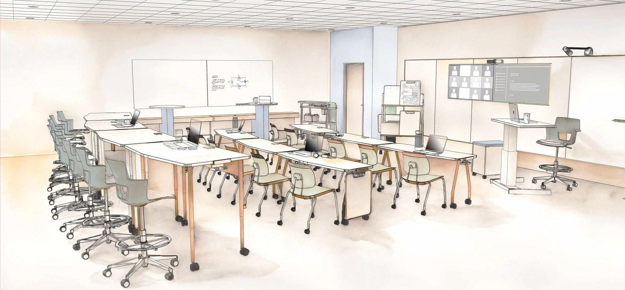 These large spaces are great for implementing learner-centered strategies that encourage student participation and interaction. By offering a variety of flexible zones, from soft seating to standing-height tables, these classrooms empower students to choose which settings best support their needs.