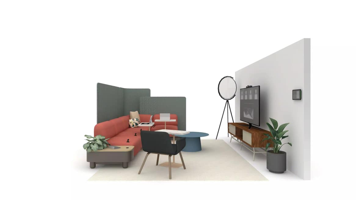 This setting is adjacent to a larger enclosed meeting space and is intended to be a natural breakout space. It is also reservable and located on a main corridor so could also be used as on impromptu dyadic or triadic space to connect and share content or take a virtual call. The acoustic divider provides visual boundary as well as sound absorption.