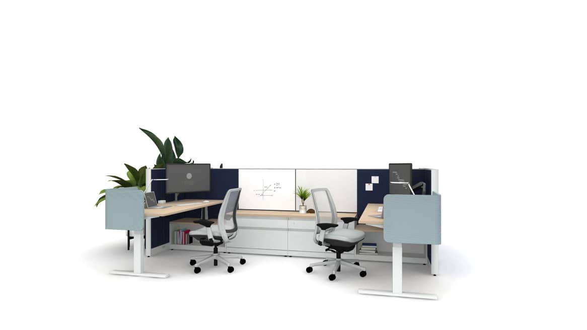 This four-pack of owned workstations features high-performing products like Migraton SE and Amia Airback, which enhance productivity and comfort throughout the day by offering standing and seating height positions. Universal Storage units with locks store personal belongings and work tools. Sarto screens are located at the corners of the desks to provide privacy to the users, whether seated or standing.