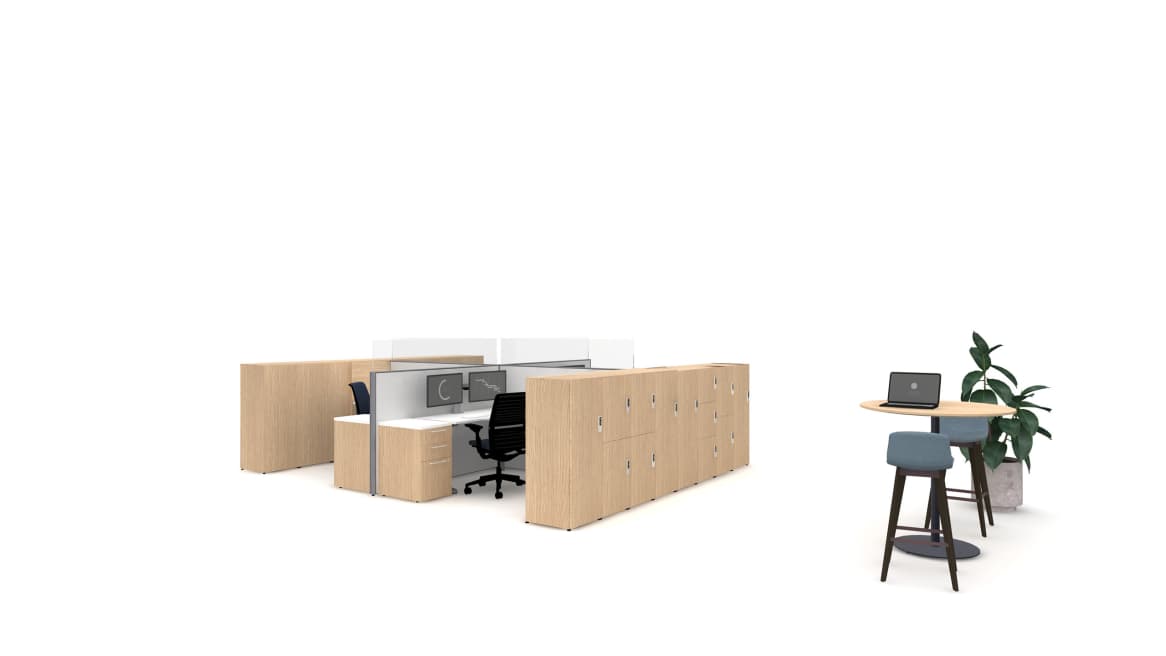 A four-pack workstation configuration that combines privacy, functionality, and integrated storage. The layout uses Ology L-shaped HAD desks for ergonomic work surfaces, complemented by frosted glass panels for visual separation between users. Work Valet lockers provide personal storage and boundary definition, while an adjacent casual collaboration area with a high table and stools supports quick meetings and informal interactions. This design balances focused work with team connectivity.