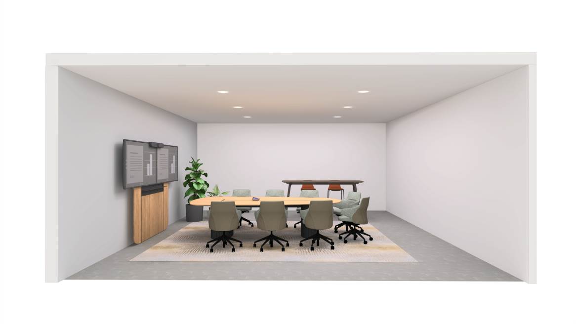 This hybrid boardroom enables high‑engagement meetings with clear visibility, strong camera presence, and seamless content sharing. The inclusive table shape ensures everyone is seen and heard, while integrated technology supports dual‑screen presentations and hybrid participation. Ergonomic seating and streamlined mounting solutions create a polished, efficient space for strategic discussions and executive‑level collaboration.