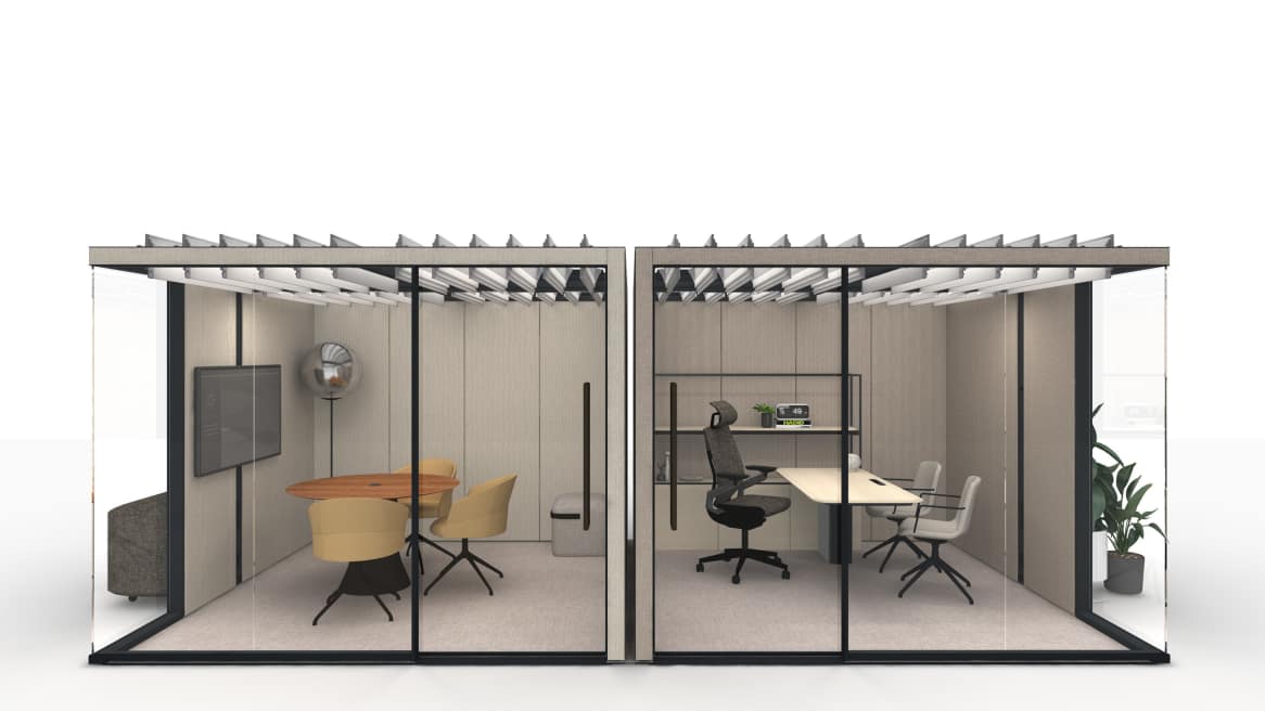 The private office supports individual work and one-on-one conversations, while the meeting room accommodates small group collaboration. Together, they offer a compact and functional setup that supports varied work needs within an open plan.