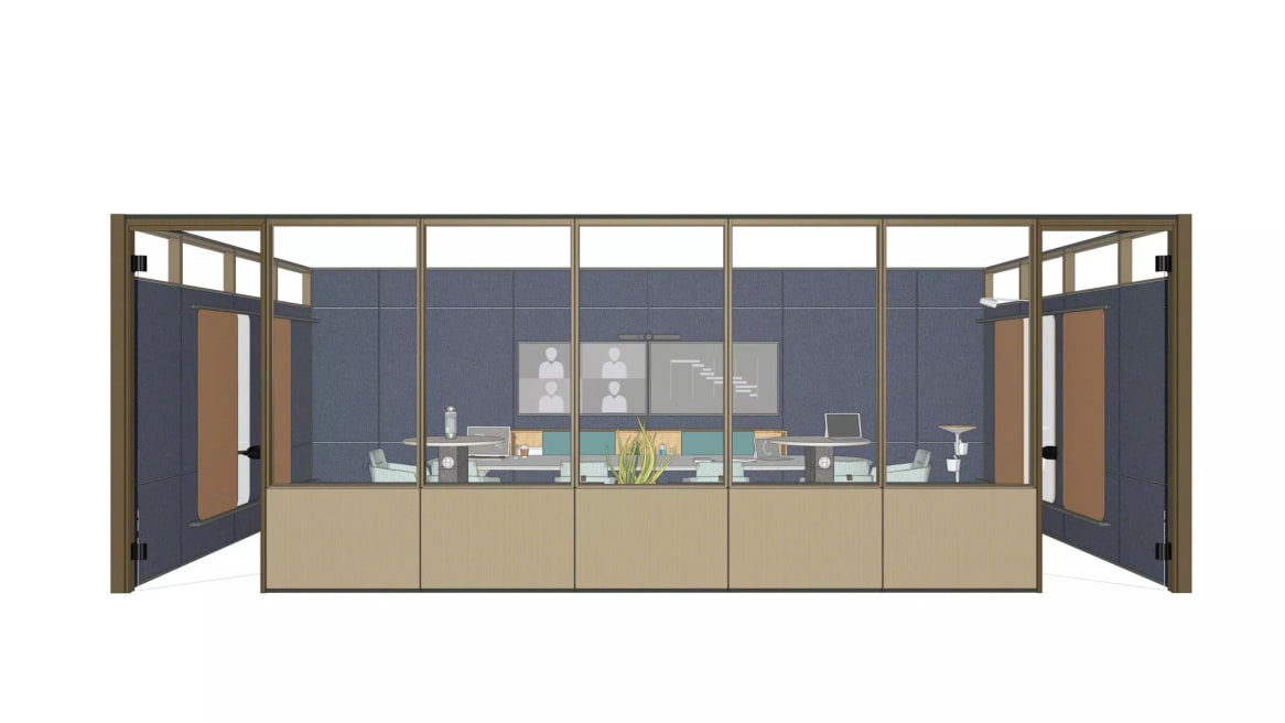 A meeting room that supports hybrid collaboration between collocated and remote colleagues. Dual monitors are centered in the room to share digital content and see remote participants and analog surfaces are located one either side of the room. The room has two tiers, there is a main task height conference table with secondary seating along the back wall to perch.