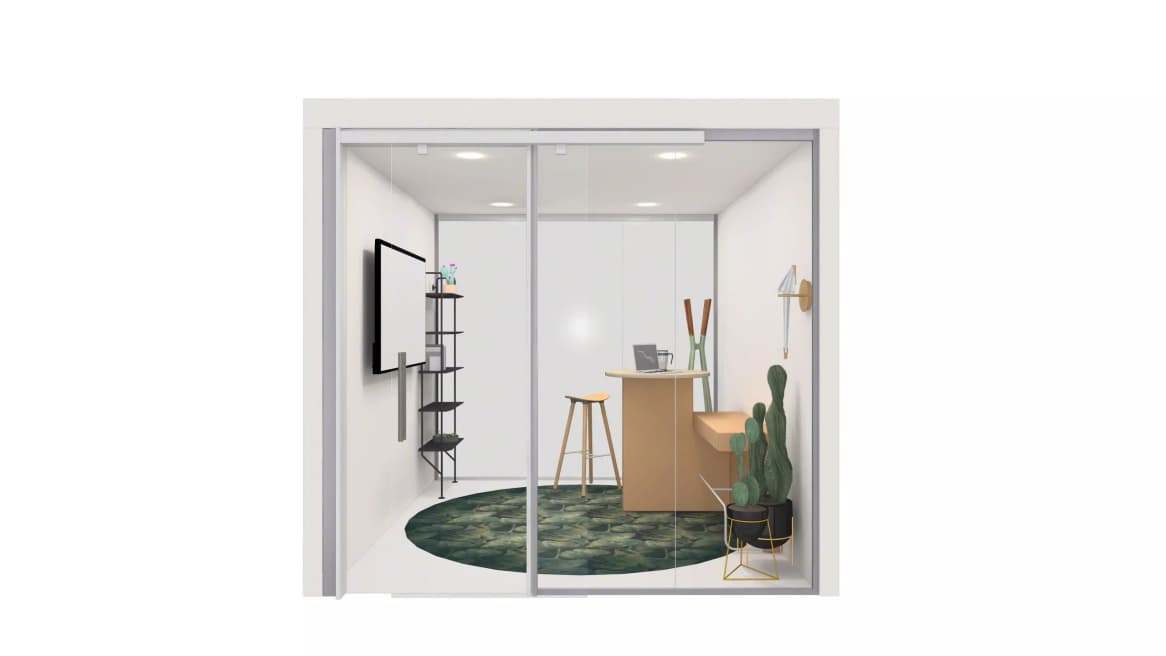 This setting pairs touch enable display with standing height furniture for hybrid generative work. Interactive displays with digital boarding make content creation a more equitable experience between remote and co-located participants.