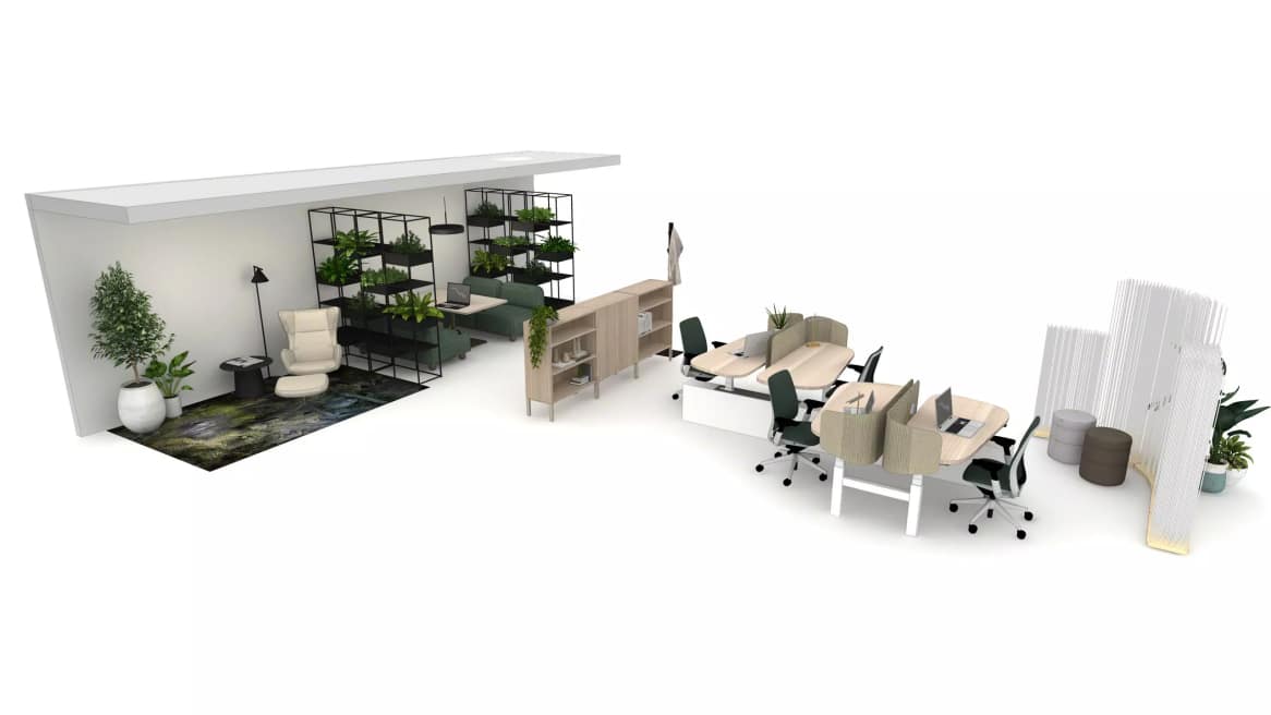 Coalesse Ensemble Lounge System, Solo Armchair, Urban Shelf, Sticks Divider, Grab Pouf, Steelcase Series 1, Lagunitas Table, Elective Elements
