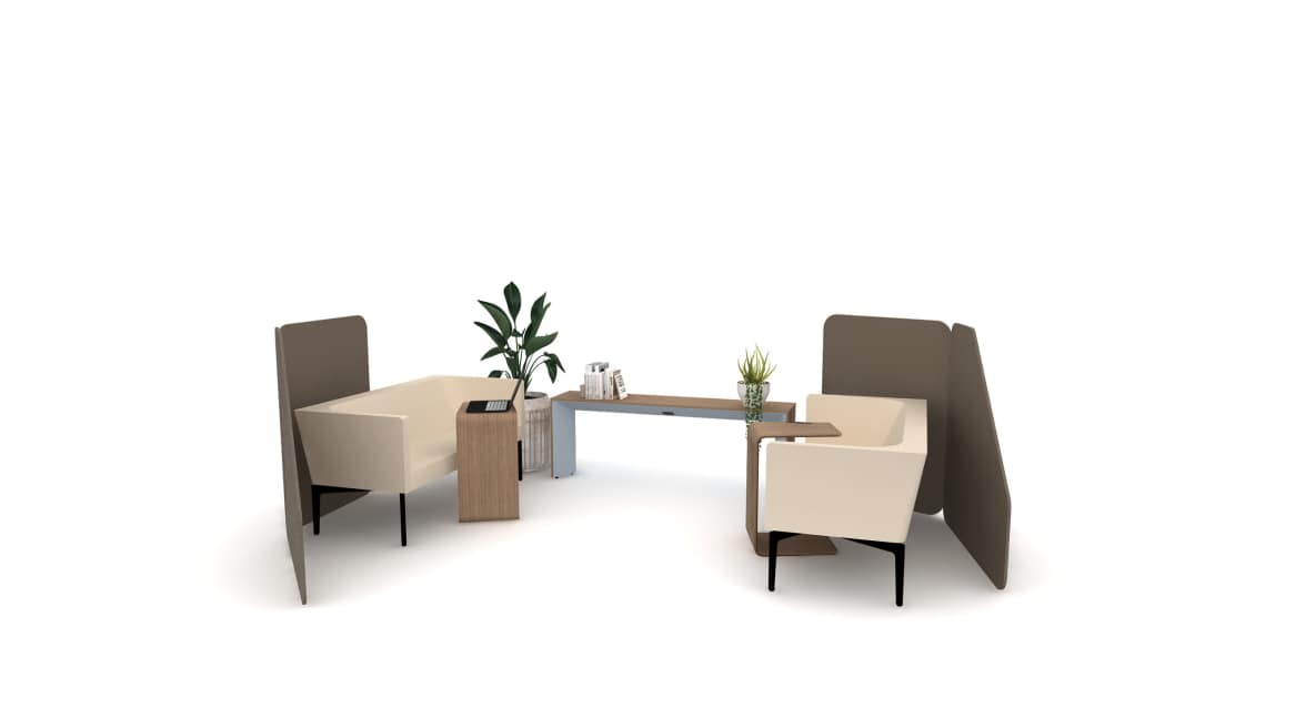 A flexible lounge setting that supports both casual meetings and focused work. The design uses Bivi Rumble couches paired with personal tables for individual tasks and a shared Campfire table for collaborative activities. Flex screens provide visual separation, creating a semi-private environment that balances openness with functionality.