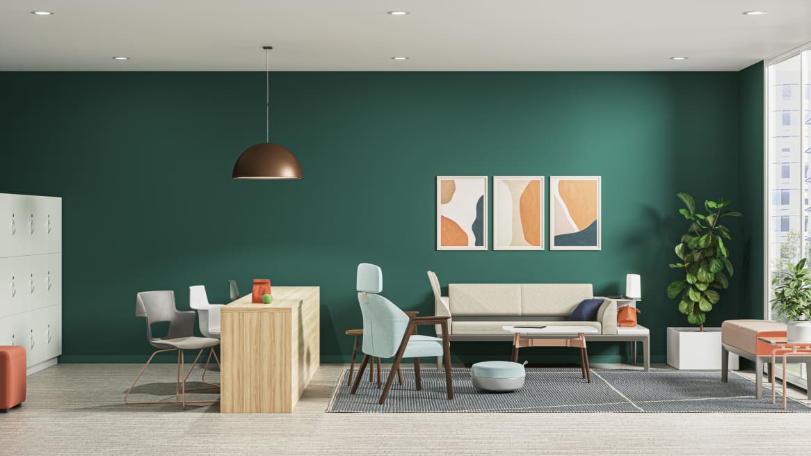 Provide an enclosed meeting space for 3 people, designed for focused and uninterrupted collaboration. The configuration uses Everwall space division panels to create a private zone, paired with a Montara 650 round table and Amia stools for ergonomic comfort. A wall-mounted screen supports presentations and virtual meetings, making this setup ideal for small group discussions in open-plan environments.