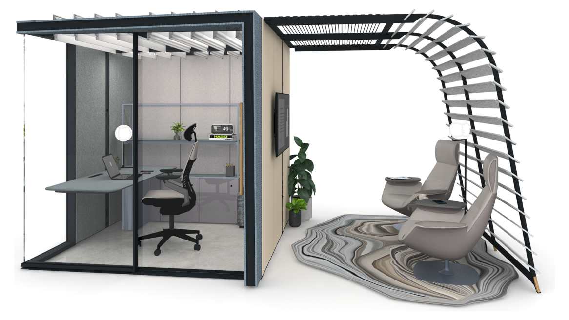 This private office combines focused workspace with a lounge setting under the awning, creating a balanced environment for productivity and pause. The lounge area offers a comfortable retreat for informal moments, reflection, or quick breaks—enhancing wellbeing and reducing stress.