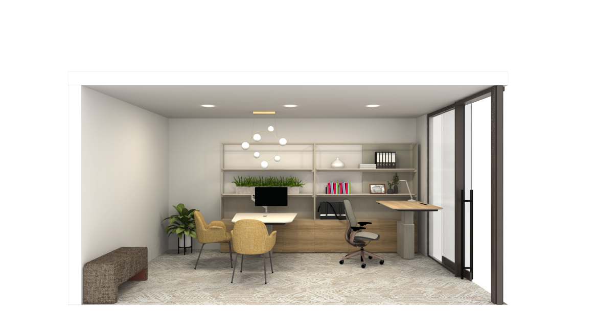 This private office is designed to support deep focus while making space for quick, collaborative moments. It combines comfort and functionality with ergonomic seating, flexible work surfaces, integrated power, and a mix of open and closed storage. Personalization is encouraged through adaptable work tools and thoughtful details that promote well-being.