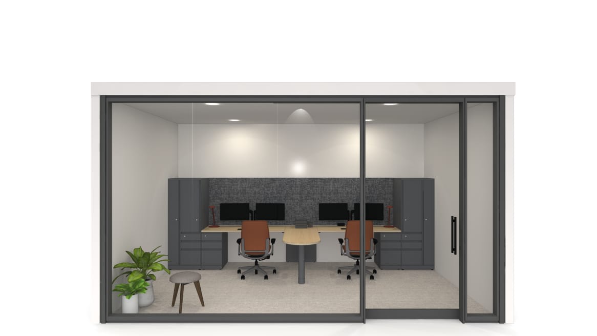 This shared private office supports focused individual work and confidential collaboration within a cost-effective yet refined setting. Answer Freestanding delivers a streamlined solution that achieves a consistent aesthetic across the floor plan, from open spaces to private offices. Its smart kit of parts enables easy reconfiguration and rearrangement, providing flexibility for evolving team needs without sacrificing visual cohesion. Integrated storage ensures personal and team materials remain organized and accessible. The clean, minimal design promotes a professional atmosphere ideal for healthcare and government offices.