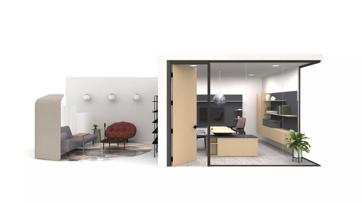 This space hosts a private office that supports focus work and collaboration. Ample open shelving and enclosed storage is provided, along with a monitor to share digital content. Adjacent spaces offer nooks for social connections with colleagues and a place to touchdown to catch up on emails and light focus work.