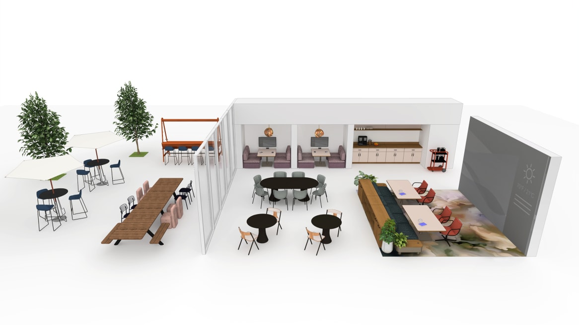 This Work Café is designed as a dynamic social space that supports a range of activities throughout the day. It offers employees a break from screen-based work, encouraging interaction, relaxation, and wellness. A variety of seating arrangements and postures (both indoors and outdoors) allow users to choose how and where they engage, whether for casual conversations, collaborative moments, or personal downtime. The space intentionally avoids solo seating to promote community, while features like a coffee bar and media wall support informal gatherings and company events.