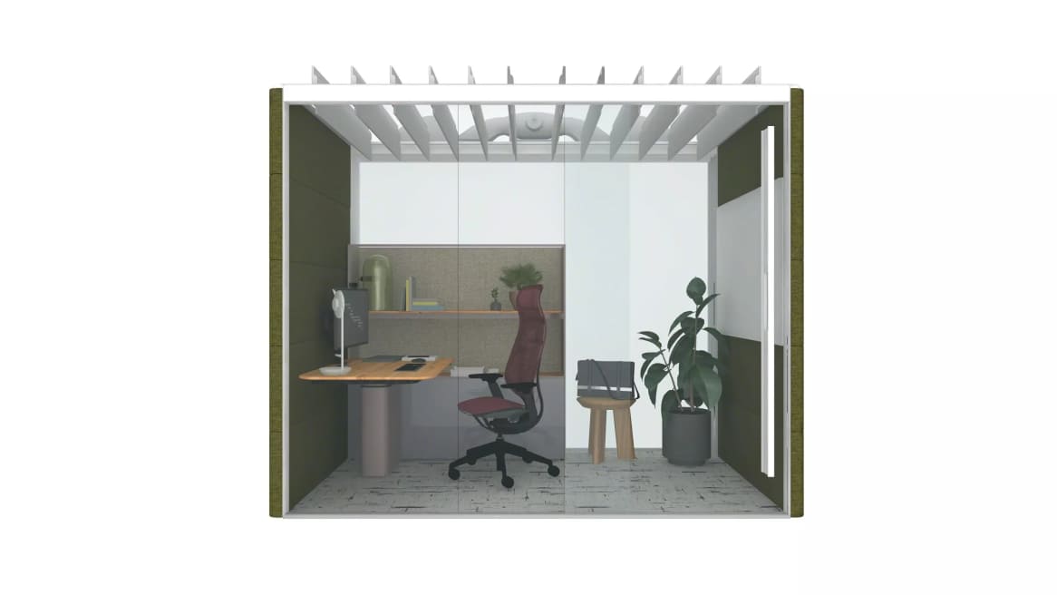 An individual pod gives users the privacy they need for video calls, both visual (with a film on the glass) and acoustical. Users can adjust the height of the desk for their personal preferences and adjust the louvers on the pod for more air flow or more acoustical privacy. Pod allows facilities to install and move to a different location more easily if needed.