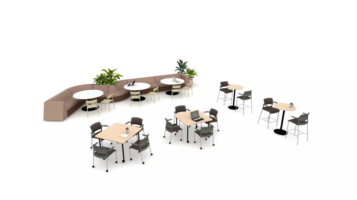 This neighborhood cafe features a variety of settings that work well together. The lounge’s abstract shape effectively delimitates an area within the open plan. The tables in the lounge area have access to power, facilitating work while grabbing a snack or changing settings during the day. The chairs and tables have casters or are easy to move and stack to reconfigure the space to each user’s needs.