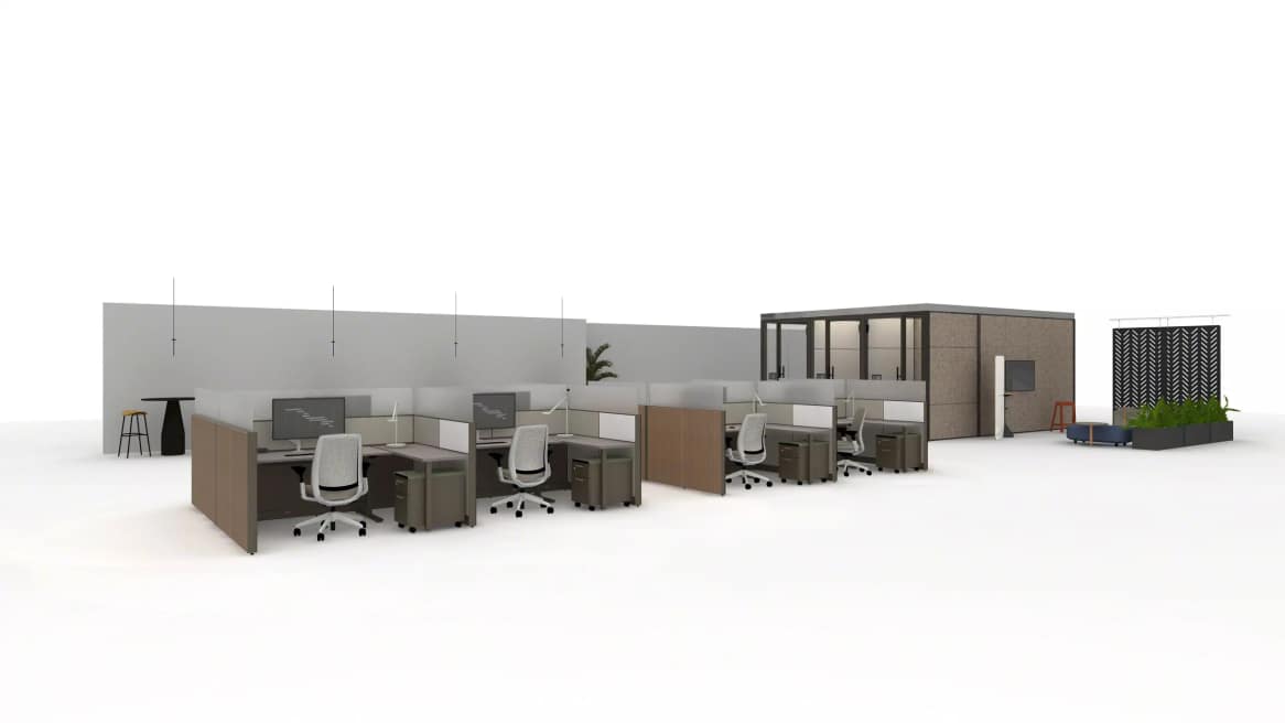 This open-assigned workstation centers around Answer Panel to create a functional and visually refined space. It balances openness with privacy, supporting both focused work and collaboration. This setting is supported with Dual Monitor arms, Mobile Pedestals to store personal belongings, whiteboards, desk lamps, and Height-Adjustable Desks for best performance. Adjacent to this setting are bookable enclaves that enable more privacy, while a nearby open collaboration space is available for quick touch-base meetings during the day.