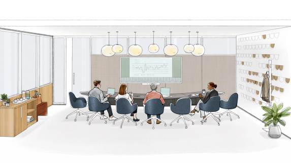 versatile seating and nontraditional table shapes that improve sightlines. Hybrid technology ensures every participant — remote or in-room — has equal access to people and information, making each conversation clear, equitable, and productive.