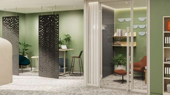 away from rigid lines, instead creating approachable layouts that protect acoustic and visual privacy. Flexible furniture supports scalable branch formats, while adjacent “step aside” spaces give staff the chance to decompress and recharge.